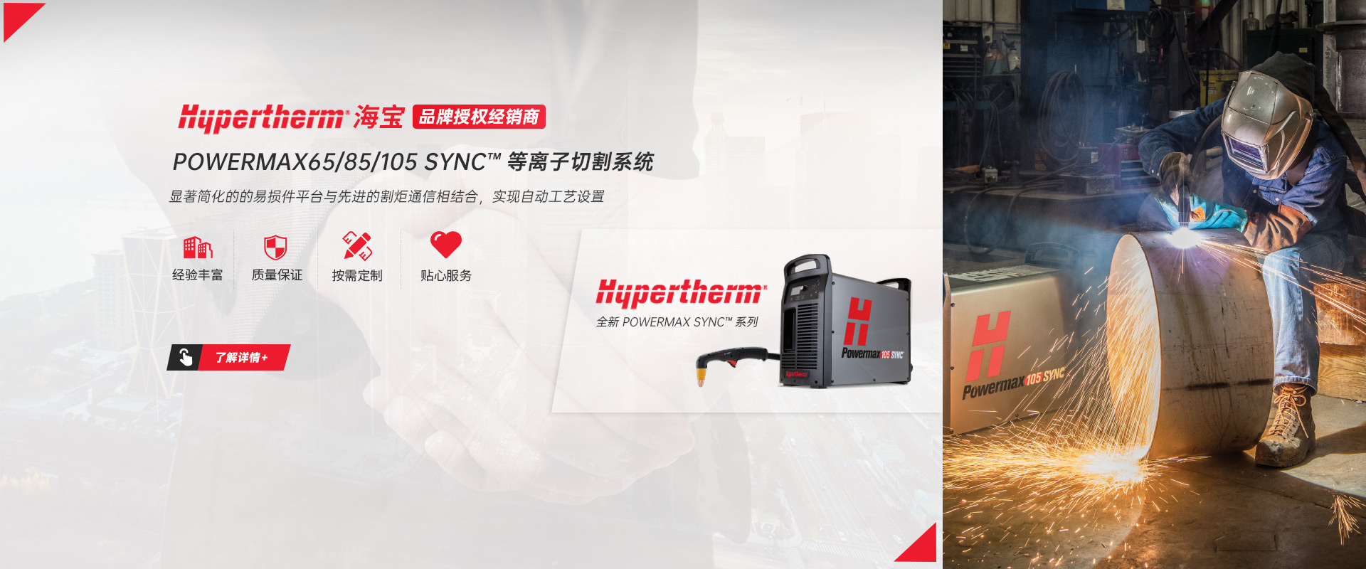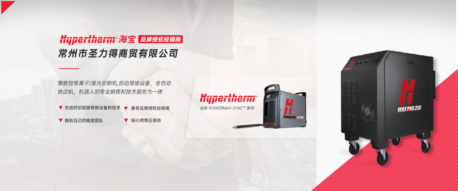 常州市圣力得商贸有限公司是一家集数控等离子/激光切割机,自动焊接设备,全自动铣边机,机器人的专业销售和技术服务为一体的公司。本公司是世界品牌Hypertherm(美国海宝)公司的授权经销商?! 」臼且恢Ъ际跷榷ā⒎裼帕?、富有朝气的精英团队。公司致力于将国外先进的切割跟焊接设备和技术介绍给中国的机器制造商和终端用户,并为用户提供品质的产品和完善的售后服务?! 」局饕硪韵虏罚骸 ?.美国海宝Hypertherm等离子机用电源,手持电源,原装易损件及备件  2.韩国赛拉科(CERACO)铣边机,南京顶瑞自动焊接小车  3.迈誓坦(MicroStep),日本田中(TANAKA),武汉法利莱(FARLEY-LASERLAB),江苏博大品牌等离子切割机,激光切割机及维修配件。  4.美国海宝,美国飞马特,凯尔贝等原装正品易损件及配件  5.激光切割机,等离子切割机,火焰切割机升级,安装与调试及技术升级改造项目  6.机器人焊/切生产线  热忱欢迎广大用户前来询价及洽谈。